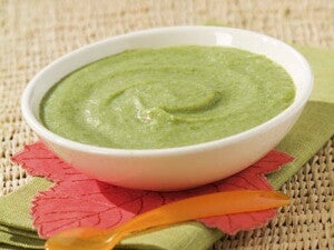 Mix de aardappel en de sperziebonen met de aangemaakte zuigelingenvoeding of borstvoeding.